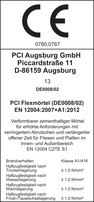 – der Klassifizierung C2 TE S1 (PCI Flexmörtel) bzw. C2 FT S1 (PCI Flexmörtel Schnell) nach DIN EN 12004.