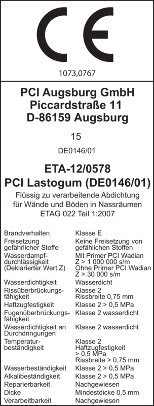 - Entspricht den Prüfgrundsätzen zur Erteilung eines allgemeinen bauaufsichtlichen Prüfzeugnisses für Verbundabdichtungen in Verbindung mit den Klebemörteln PCI Carraflex,PCI Carrament, PCI Flexmörtel S1, PCI Flexmörtel S1 Rapid, PCI Flexmörtel S1 Flott, PCI FT Extra, PCI FT Flex, PCI Nanolight, PCI Nanolight White.