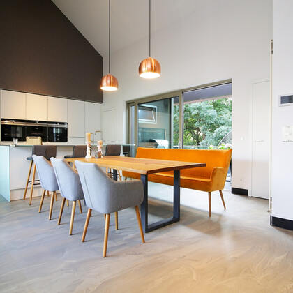 - Für Innen als direkt nutzbarer, verlaufender, verschleißfester zementärer Bodenausgleich.